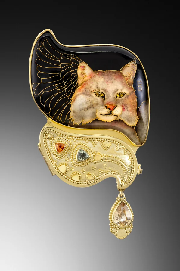 Artist Statement: Bobcat crossing my path. Residing in the Bobcat’s locket is the sleeping, dreaming secret. cloisonné, 18K granulation, sapphires.