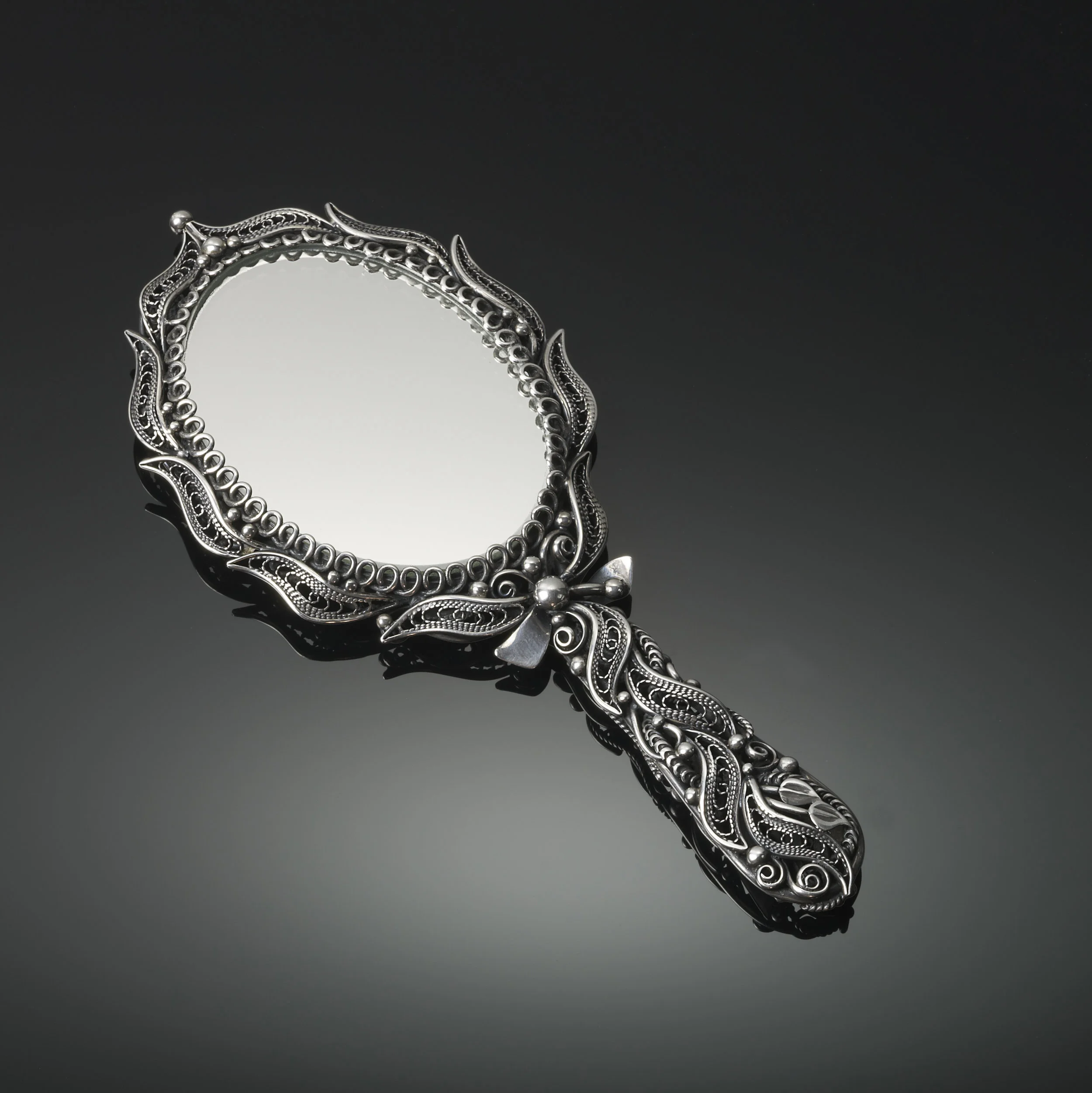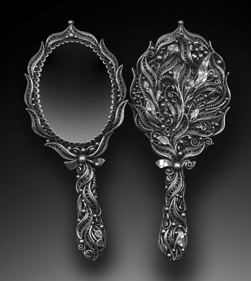 Artist Statement: This filigree mirror is handmade from rendered U.S. quarters. The quarters were melted into ingot form and then rolled into wire form and pulled to the appropriate sizes by hand. The frame was made first, and each decorative piece was handmade and added individually to the desired balance.